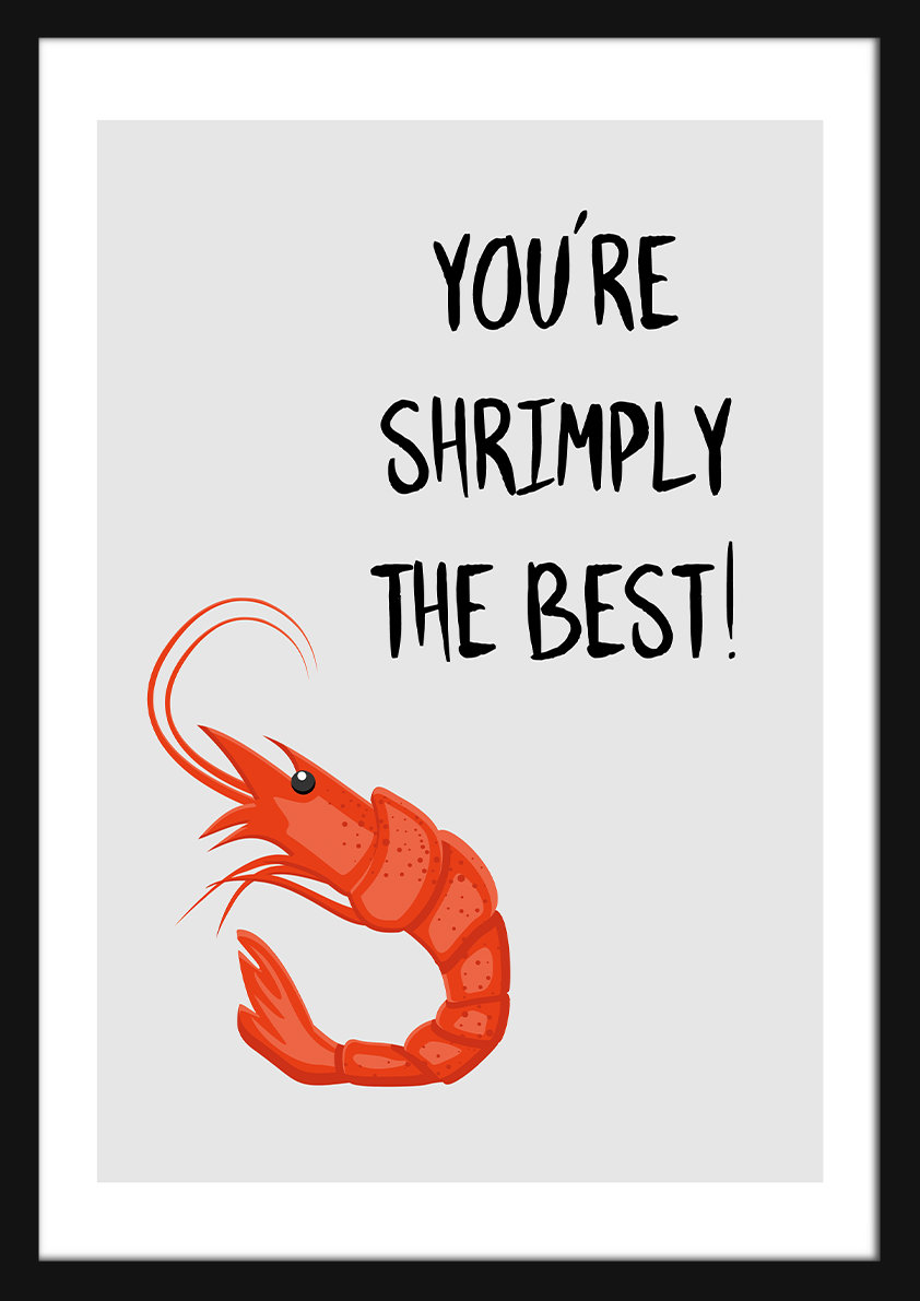 Affisch med texten ”You are shrimply the best!” Ge den till någon du tycker om. Du kan välja om du vill ha affischen utan ram eller om du vill ha svart eller vit ram i trä med plexiglas. Storlek A4, ca 21*30cm.